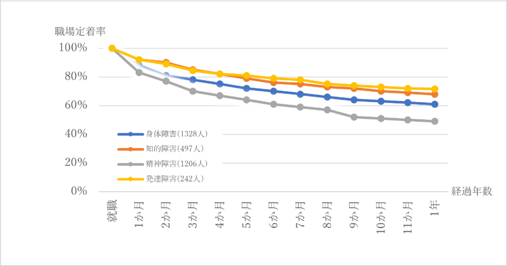 ⇒障害者全体の平均定着率:(0.04802+ 0.04802 + 0.0175) ÷ 3 = 0.038 = 3.8%